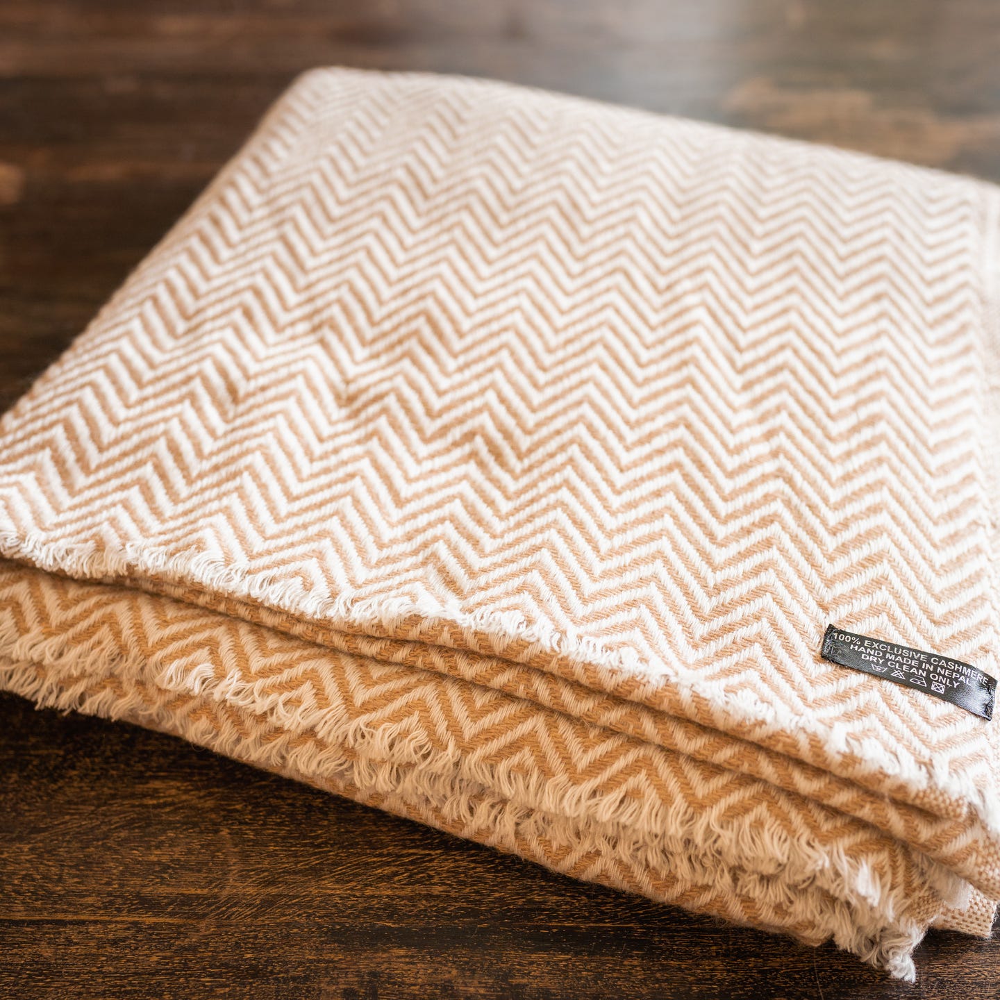 Coperta in cashmere marrone con motivo a grande spina di pesce